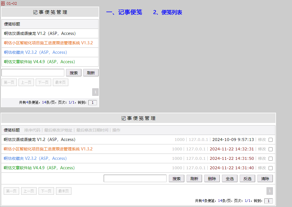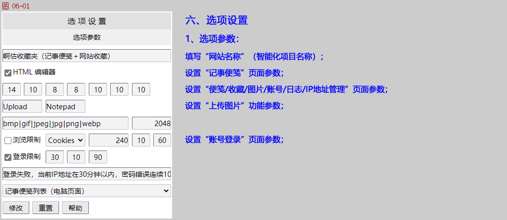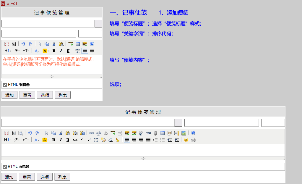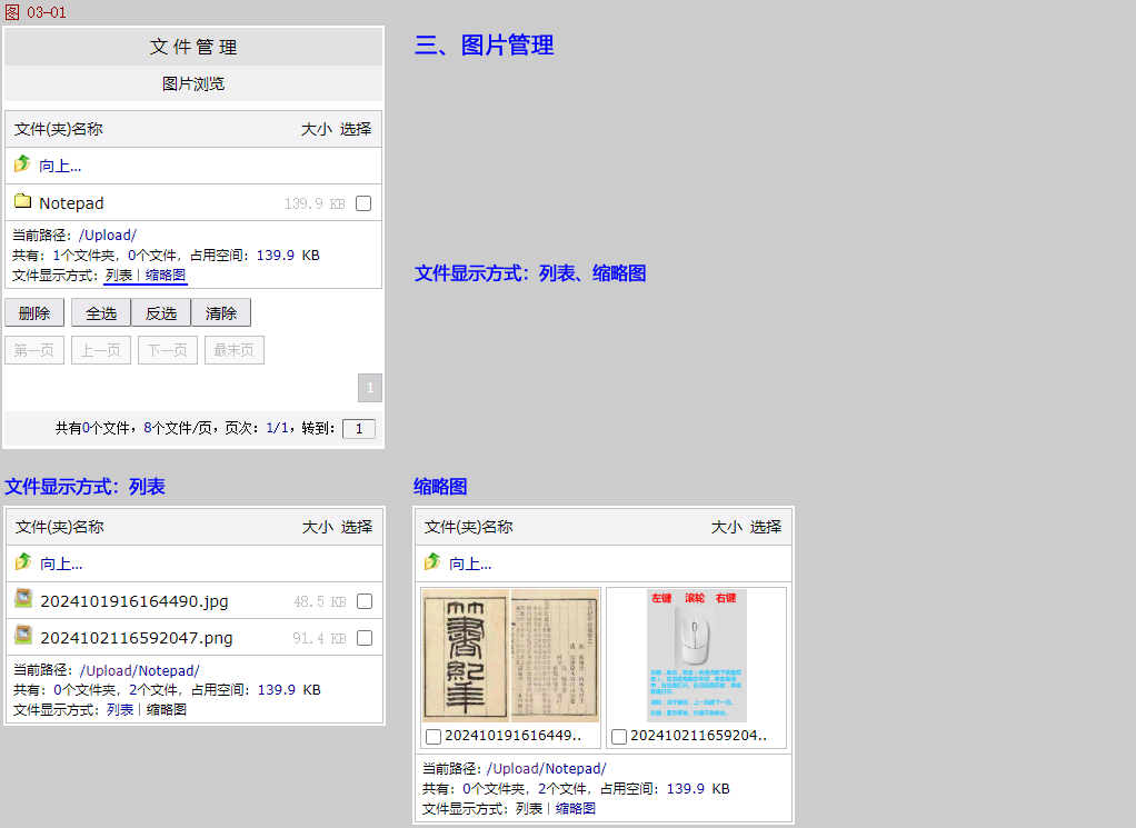图片管理:浏览/删除上传的记事便笺图片,在〖选项〗页面可以设置上传的文件夹、允许上传的图片类型、大小。