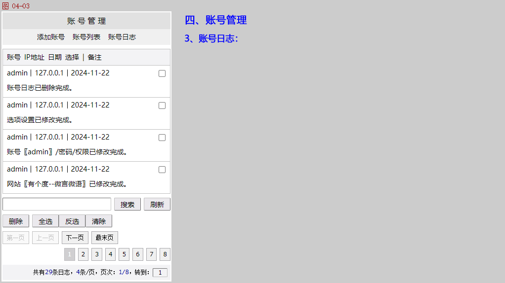 账号日志:添加/修改/删除数据都可以记录日志,包括管理账号登录成功、登录密码/验证码错误、修改密码/权限。