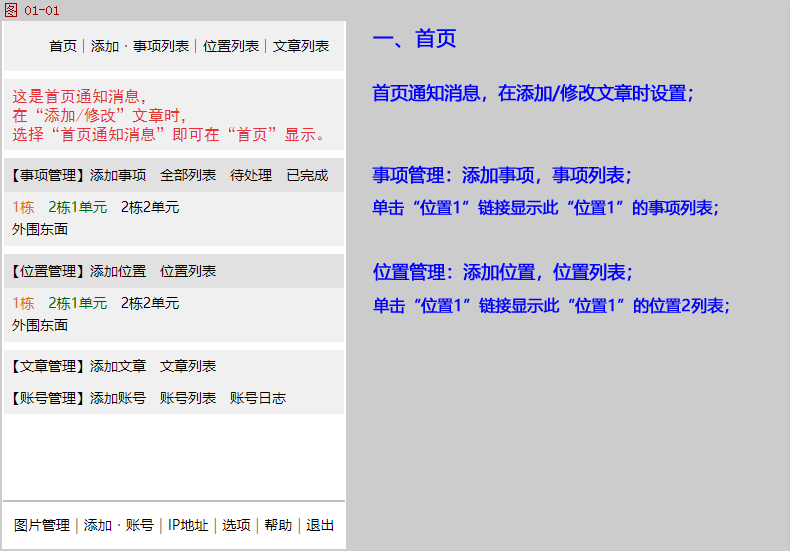 文章/资料管理:把项目相关的文章/资料添加到此系统,方便施工人员浏览/阅读。也可以设置其中一篇文章为“首页通知消息”,施工人员登录到此系统即可看到最新通知消息。