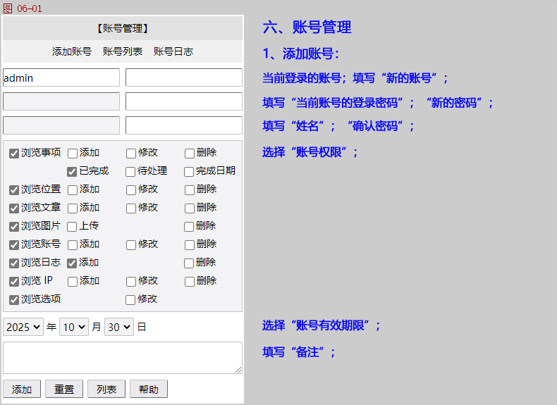 账号管理:添加账号,可以设置账号对每个页面/功能的操作权限。