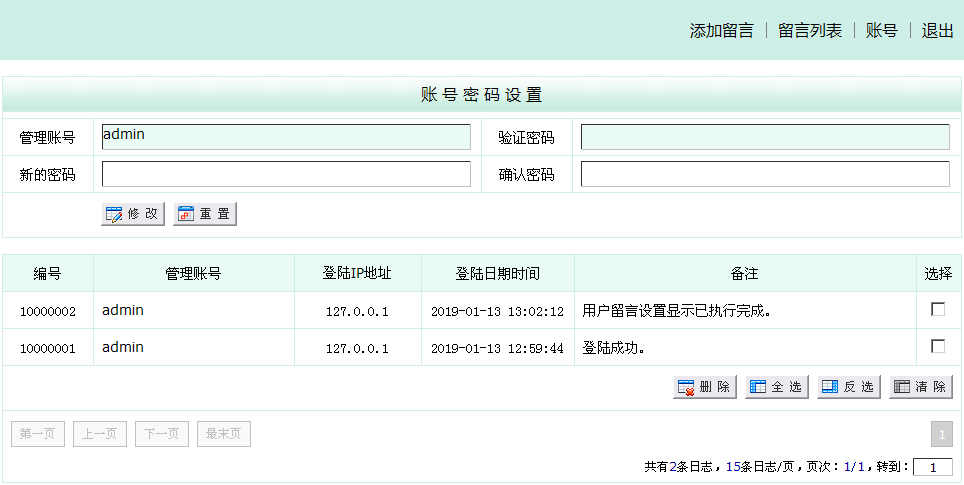 一款简单的在线留言簿网站系统:可以设置用户留言间隔(同一IP地址间隔多少秒才能再次留言),自动发送用户留言到指定邮箱。查看用户留言(需要登陆管理设置留言为显示后用户才能看到,也可以回复留言),搜索留言。管理账号只有一个,管理账号和密码可以自行修改。登陆失败锁定程序(默认:同一IP地址在2分钟以内,连续登陆失败10次,系统自动限制IP地址60分钟。)。登陆成功/失败、退出、设置留言显示/隐藏,删除留言等自动记录日志。